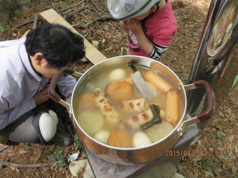 お昼は前回に引き続きロケットストーブが活躍、おでんを温ためノンアルコールの缶ビールで乾杯しての楽しいランチタイムになりました。
