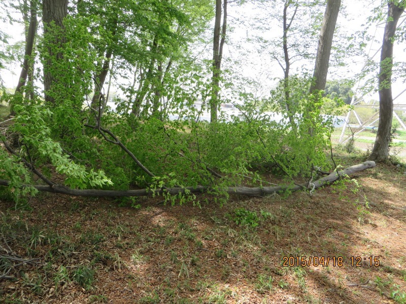 主作業は樹木(イヌシデ)伐採。今回はリーダーの指示で森と藤平(靖)が担当。前回に比べると狙い通りに倒すにはかなり難しい伐採です。重心が倒木方向とは逆の斜め後ろに大きく反った木を狙い通りに倒すには正確な受け口/追い口の伐り込み、そして的確なタイミングでの強力なロープ引きが必要です。実作業は受け口の切り込みが浅かったためなかなか倒れず苦労したのですが、何とがロープワークのお陰で狙い通りの方向に倒すことが出来ました。(その時の様子は最後に紹介するyou-tube動画をみて下さい)