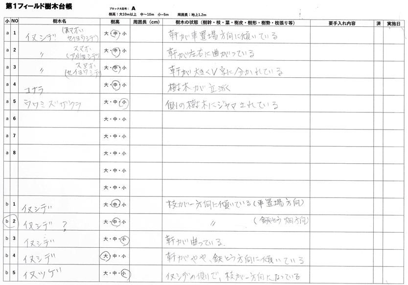 ①3人で分担して樹木に付けた名札へマジック細ペンで樹木名記入、及び森が用意した樹木台帳に樹木名と樹木の状態等を記入しました。(例:吉田さん記入台帳)。