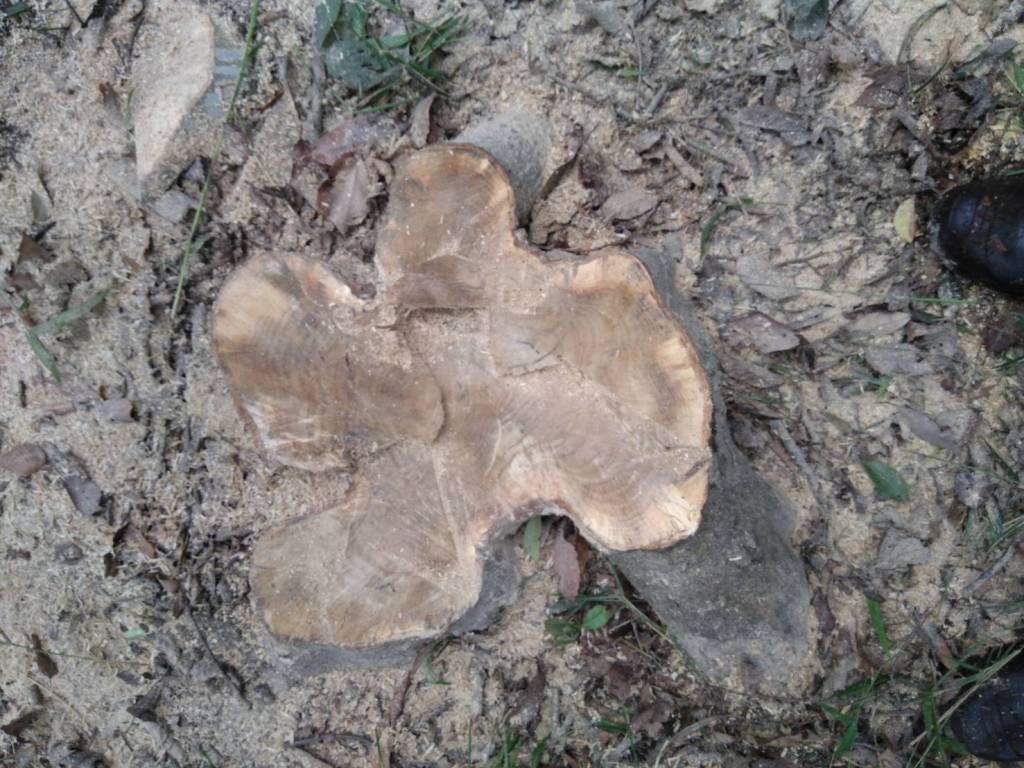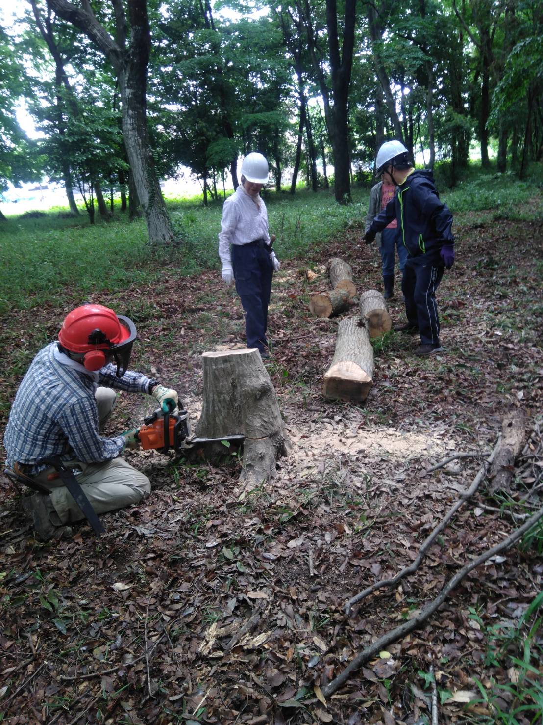 前回目を付けていたFa-6イヌシデ枯損木の伐採。何年ぶりだろう、久々の樹木伐採。先ずは皆で樹高目測:15m-25m。そして三角法で。結果は20mだった。続いて伐採にとりかかるもロープ掛けに一苦労。青野さんのチェーンソーの活躍でロープ引っ張り1回であっけなく伐倒できました。樹齢およそ30年余。4本ヒトデ形の味ある切株でした。