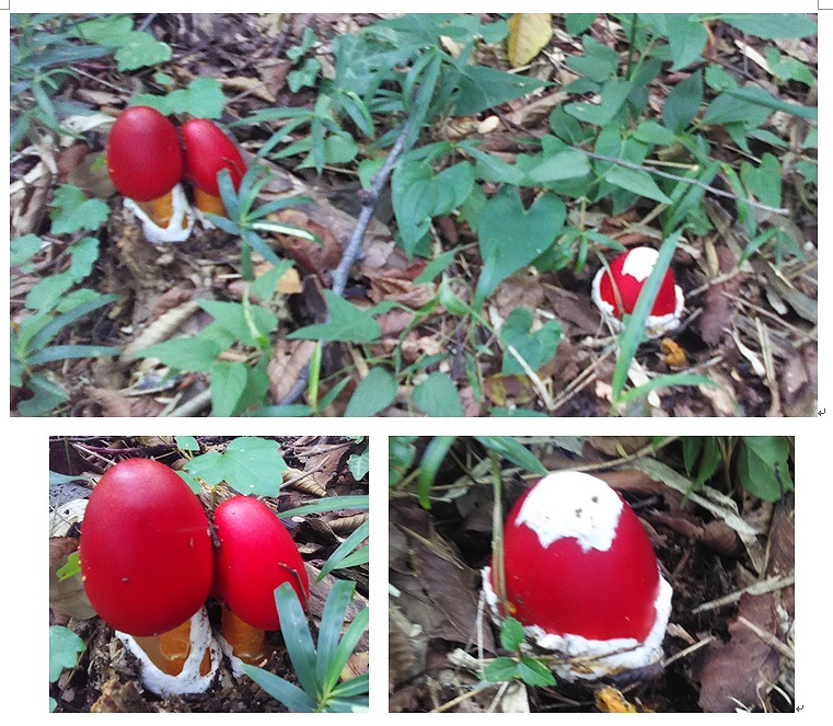 ②これまた生まれたばかりのたまご茸を第1フィールドで発見!朱色鮮やかで毒々しいですが毒キノコではなさそうです。