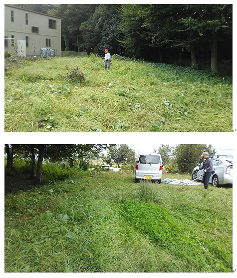 9月25日(日)、内牧第1フィールド入口(樹林周辺の駐車広場及び住宅側原地)の草刈実施。前回6月の作業から3か月経過しており、ひと夏での夏草の生育の凄さには唖然。倒れた雑草にさらにそれに重なるように伸びすぎた雑草の草刈りは2台の刈払機でも悪戦苦闘だった。