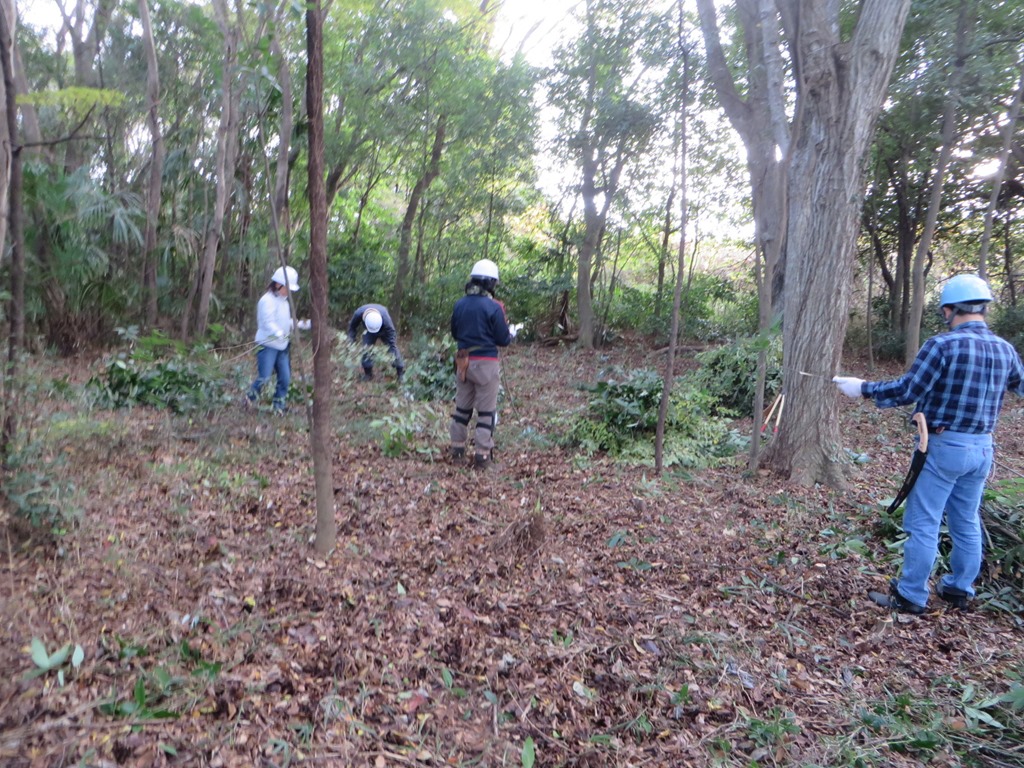 ヒノキの伐採では未体験者を優先的に、受け口や追い口、ノコギリの使い方、玉切り、枝処理、ロープワークなど一連の作業を詳しく教えた。間伐体験者2名は頼りになる存在だった。若い人は体力もあり物覚えも抜群で、スローライン・ショットパウチの投げ方も、1投教えたらすぐマスターした。ノコギリの使い方も中々スジがいい。